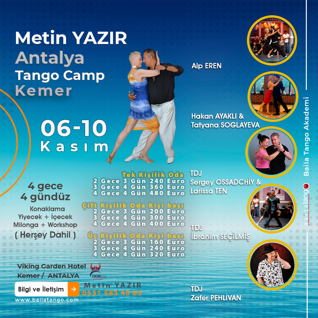 [vc_row enable_arrows_animation="no"][vc_column width="1/2"][vc_gallery interval="3" images="11696" img_size="1080 X 1080"][vc_column_text] Antalya Tango Camp Kemer 06 – 10 KASIM 2025 Metin YAZIR ile (workshop – Milonga) Alp EREN - Hakan AYAKLI & Tatyana SOGLAYEVA - TDJ Sergey OSSADCHİY & Larissa TEN - TDJ İbrahim SEÇİLMİŞ - TDJ