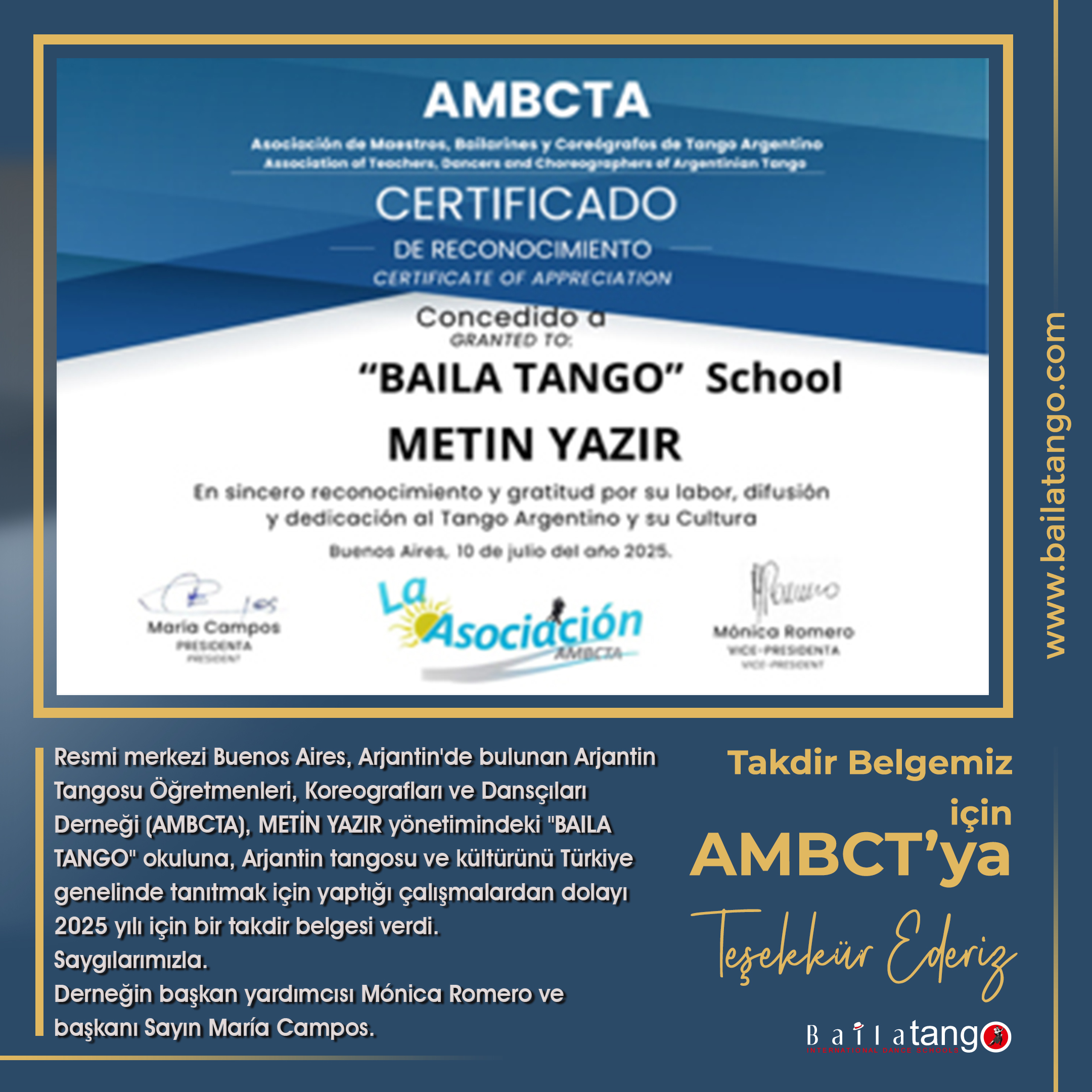 AMBCTA Arjantin Tangosu Öğretmenleri, Koreografları ve Dansçıları Derneği Takdir Belgemiz Resmi merkezi Buenos Aires, Arjantin'de bulunan Arjantin Tangosu Öğretmenleri, Koreografları ve Dansçıları Derneği (AMBCTA), METİN YAZIR yönetimindeki "BAILA TANGO" okuluna, Arjantin tangosu ve kültürünü Türkiye genelinde tanıtmak için yaptığı çalışmalardan dolayı